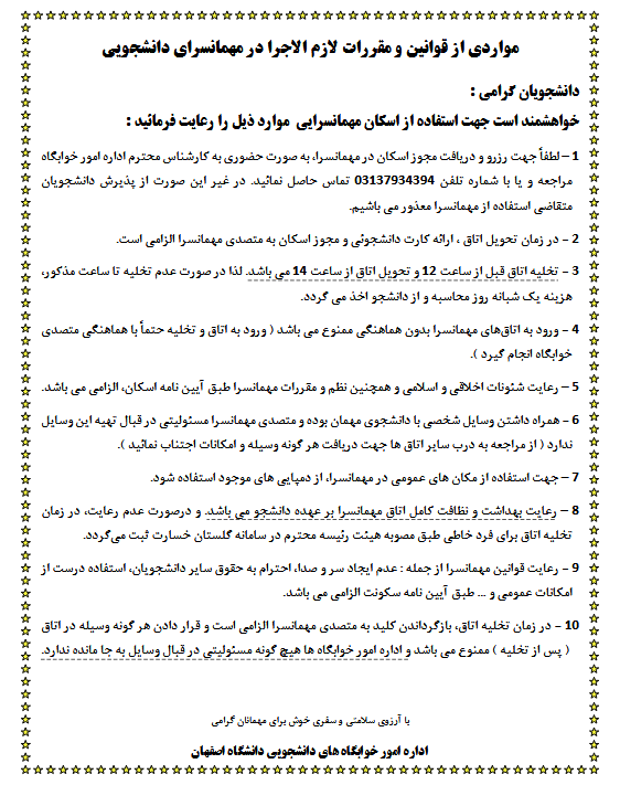 مواردی از قوانین و مقررات لازم الاجرا در مهمانسراهای دانشجویی